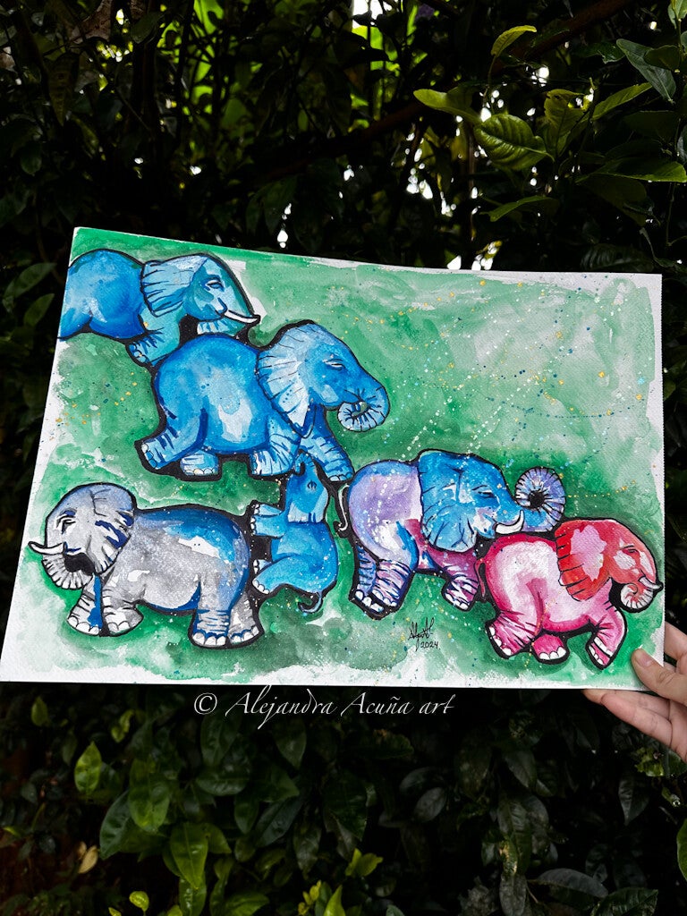 Mi versión de la fotografía de una familia de elefantes durmiendo Título : Sueños de elefantes🐘 Técnica: Acuarelas/ Fomato 29 cm x 40 com Autor : Alejandra AcuñaAño: 2024